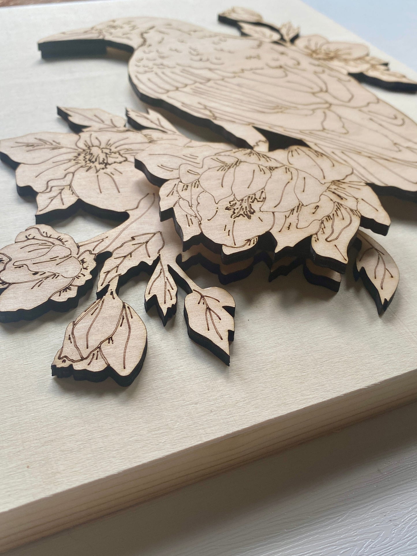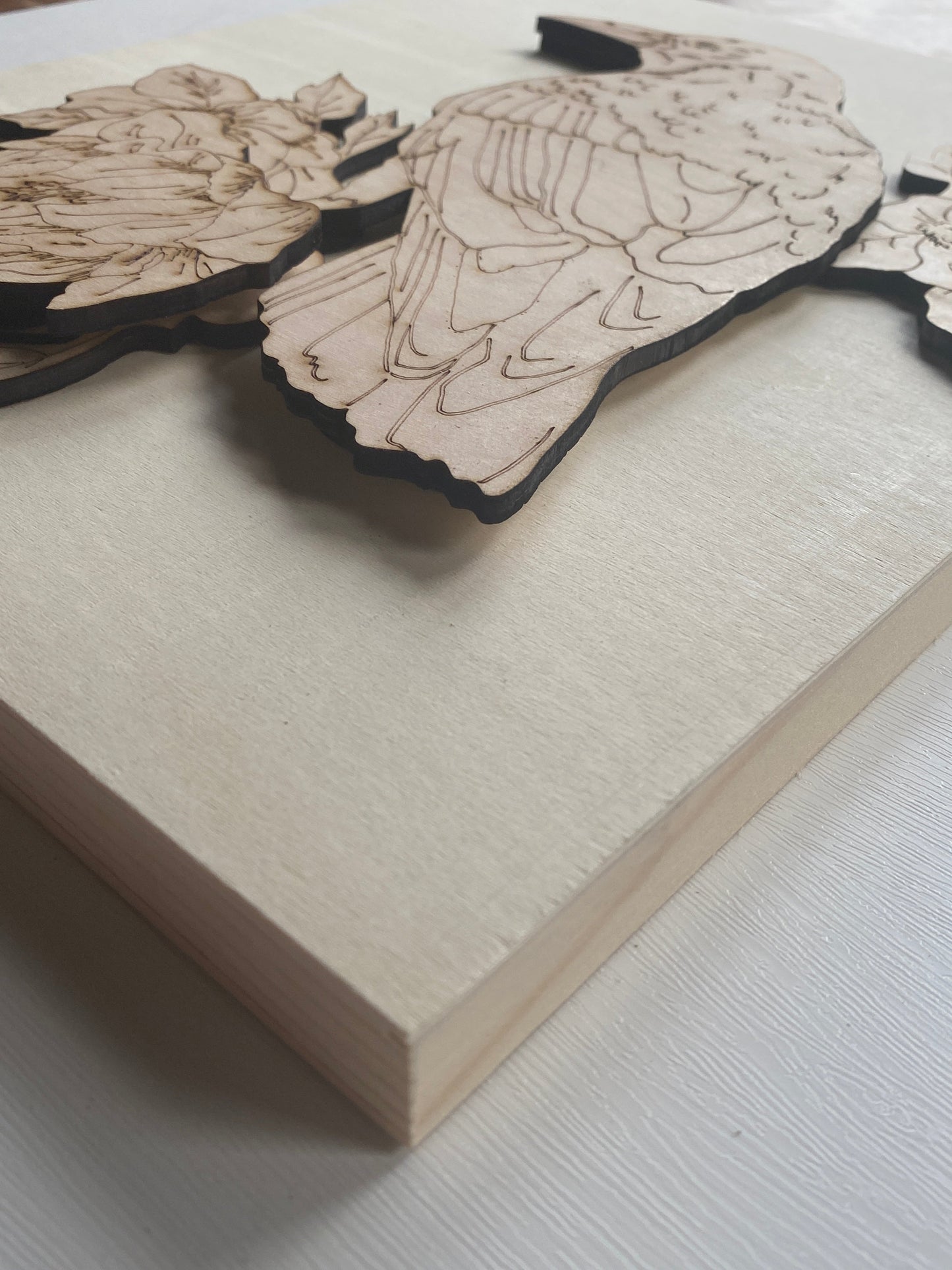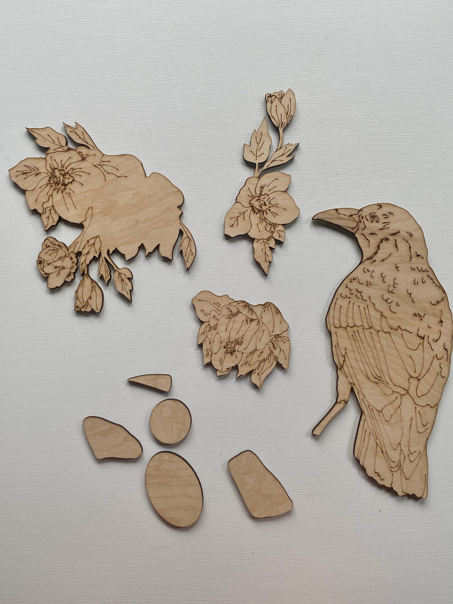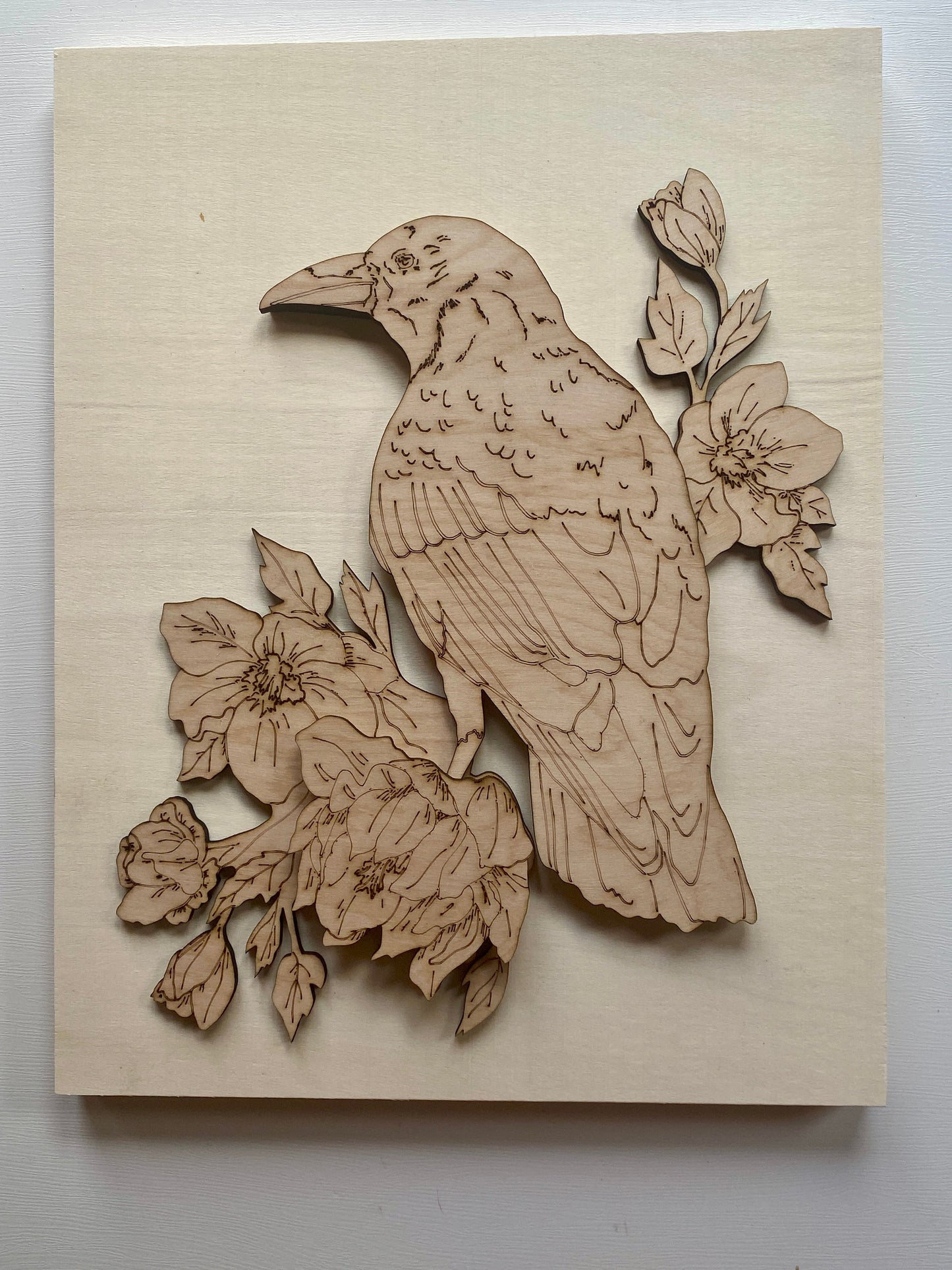 Our Midnight Crow wood cutout is perfect for a 9 x 12 or 11 x 14 substrate (not included). Learn how to paint and layer these beautiful pieces in our Midnight Crow Online Class on Patreon.