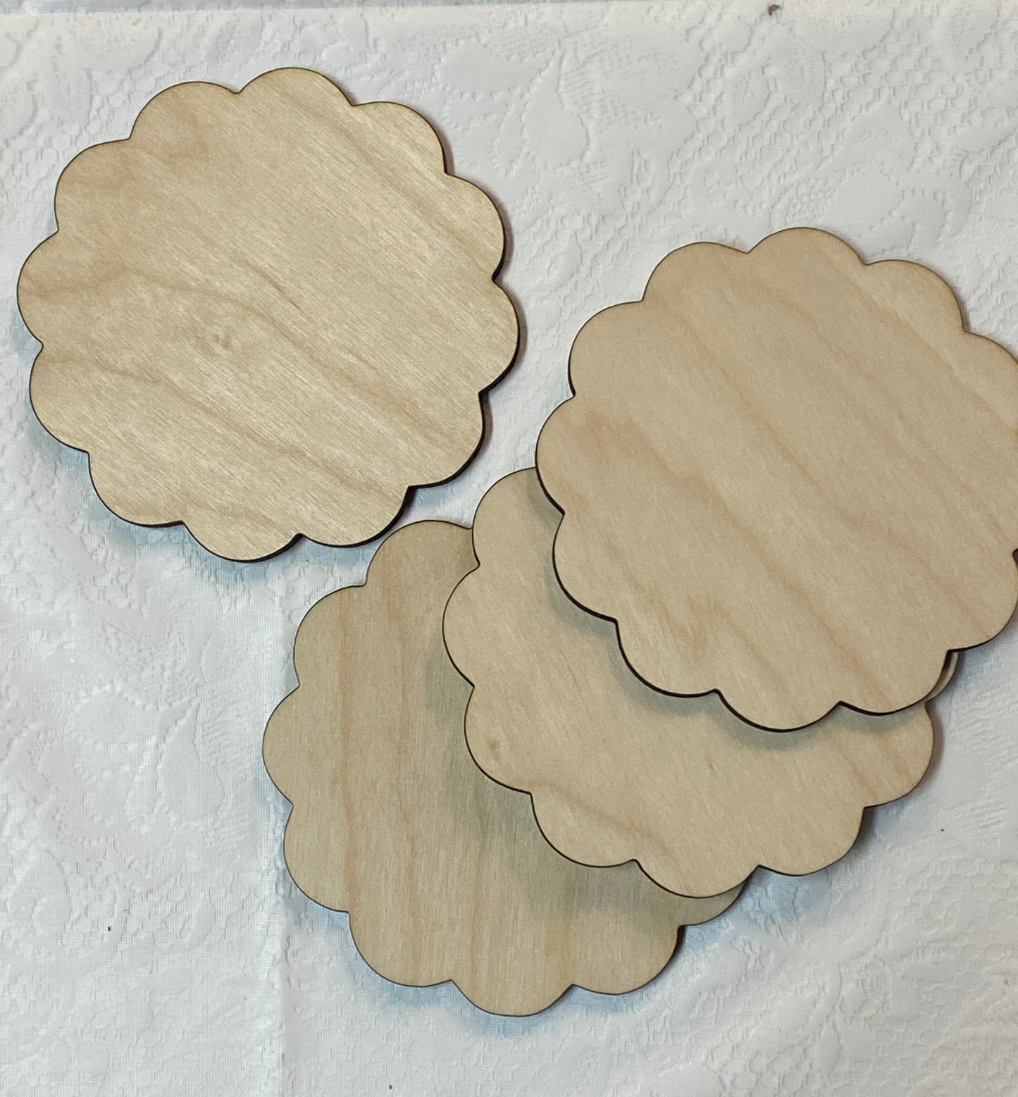These cute scalloped circles measure 4 inches by 4 inches. Great for ornaments or other small projects. All pieces are cut from 1/4 inch wood. We tape the pieces to the original wood cutout to protect them in shipping. Just remove the painters tape and carefully remove them from the backing. *Note*-This listing is for unfinished and unsanded wood cuts.
